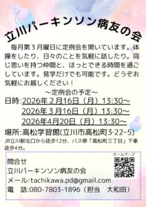 立川パーキンソン病友の会は、パーキンソン病当事者とその家族、そして本会の趣旨に賛同する市民が連携し、当事者の生活の質(QOL)の向上を目指して活動している団体です。病気に関する正しい理解を地域に広げるとともに、当事者や家族が孤立することなく安心して暮らせる地域づくりを目的としています。